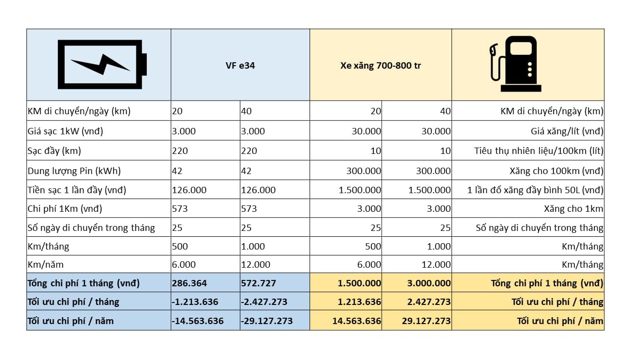 *Hình ảnh minh họa so sánh chi phí xe điện Vinfast e34 và một chiếc xe sử dụng nhiên liệu xăng cùng tầm giá 700-800tr: